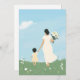 Uma ilustração serena de uma mãe e criança andando de mãos dadas num campo vibrante cheio de flores brancas. A mãe, vestida com um vestido branco fluindo, segura um buquê de margaridas, simbolizando amor e pureza. O céu azul brilhante com nuvens suaves aumenta a atmosfera pacífica e alegre.