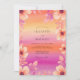 A striking gradient transitions from warm orange to vivid magenta, reminiscent of a tropical sunset. Softly painted anemones and delicate greenery accents line the edges, offering a romantic botanical feel. This vibrant aesthetic captures the energy of a seaside or destination ceremony.