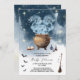 Uma magia e assustadora modelo de convite para Chá de fraldas temático. Num fundo azul estrelado do céu, uma caldeirada de bruxas cercada por poções, morcegos e vassouras é vista fazendo fumaça azul. O texto da tipografia diz que Baby Boy está se preparando. Personalize editando o convite digital ou impresso com os detalhes do evento.