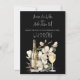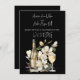 Linda Magnolia branca floresce e garrafa de champanhe e óculos em fundo preto e texto branco. Voltar é uma imagem de uma flor de Magnolia e dois copos cheios de champanhe.