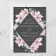 Convites florais elegantes com detalhes de seu casamento cercados por um quadro geométrico de flores de magnólia cor-de-água rosa e folhas verdes de eucalipto contra um fundo de cinza de carvão. O reverso dos convites para o casamento de magnólia apresenta um sólido fundo verde de eucalipto. Projetado para coordenar com nossa coleção de casamento Magnolia & Eucalyptus.