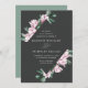 Convites florais elegantes com detalhes de seu casamento cercados por um quadro geométrico de flores de magnólia cor-de-água rosa e folhas verdes de eucalipto contra fundo de carvão. O reverso dos convites para o casamento de magnólia apresenta um sólido fundo verde de eucalipto. Projetado para coordenar com nossa coleção de casamento Magnolia & Eucalyptus.