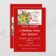 Este convite de festas de cartão plano é vermelho vibrante com um grupo de macacos coloridos com chapéus de festa, chifres e balões em um barril amarelo com o texto "Estamos nos divertindo mais que um barril de Mondeys!" Personalize suas informações com os modelos.