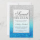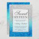 Um moderno, bonito e elegante chá brilhante prateado com um bloco de cor azul-lacrimogêneo, doce convite de aniversário 16.