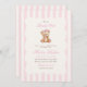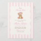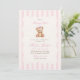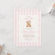 Uma doce referência à tradição com um toque de charme atemporal. Este convite de chá de bebê grandmillennial apresenta listras de aquarela rosa suave, um urso teddy em estilo vintage e tipografia elegante — perfeito para celebrar uma menina a caminho.