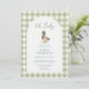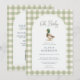 Mallard duck all in one gingham baby shower invitation featuring a charming duck illustration paired with classic gingham accents. Designed in a front and back double sided layout with coordinated artwork on both sides. Perfect for gender neutral or boy baby showers with a rustic countryside feel. Editable text for easy personalization. Print-ready layout.
