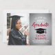 Anuncie um segundo grau ou formandos e convide a família e os amigos a celebrarem com fotos personalizadas, vermelho, cinzas e convites de festas brancos. A imagem e o texto são simples de personalizar e as cores são fáceis de mudar com a ferramenta design Zazzle. Este modelo é configurado como um cartão de anúncio combinado e um convite de festas que pode ser personalizado com quaisquer detalhes de sua escolha, como nomes de pais, honras especiais, título de grau, citação inspiracional favorita, planos futuros de formandos ou novo endereço. A design apresenta um fundo metálico esfregado, um boné de conselho de argamassa, uma caligrafia moderna elegante, uma tipografia de vintage clássica e uma foto favorita, como uma fotografia de mais velho ou uma imagem da cerimônia de inauguração. Por favor, note que prata é cor verde de cinza impressa, não papel metálico. Este cartão de formatura é uma na moda para anunciar uma celebração especial de dia. Parabéns ao formando!