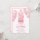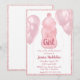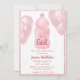 Este convite de chá de bebê personalizado apresenta um tema de bebê menina glamoroso. Uma imagem de uma mamadeira rosa é colocada perto do topo com a frase "É uma menina" impressa em uma fonte de letra elegante. Uma moldura de brilho rosa cerca a mamadeira com uma moldura de brilho correspondente cercando o convite. Balões de festa pérola brilhantes são mostrados em ambos os lados.