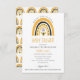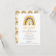 Mamães para ser o chá de fraldas temático com um arco-íris bonitinho no estilo do bolo, em cor de mel mostarda, e preto com abelha pequena no centro. O padrão de abelhas e arco-íris no verso do convite. Estilo colorido neutro do gênero com uma fonte fofa e bonita desenhada à mão.