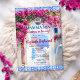 Mamma Mia a baby is on the way! Watercolor-painted Greek island Mamma Mia-themed design with bright pink bougainvillea flowers and blue Mediterranean tiles with silver disco ball.