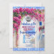 A ilha grega pintada com aquarelas Mamma Mia é design com flores cor-de-rosa magenta de bougainvillea e azulejos mediterrânicos azuis.
