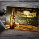 Convites de festas de aniversários de cerveja com faixa de ouro sobre fundo de garrafa de cerveja. Você pode adicionar texto e idade à etiqueta da garrafa de cerveja para personalizar este convite de festas de cerveja divertido e elegante.