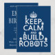 Aqui se lê 'Mantenha calma e construa robôs' e há muitos silhuetas robôs sentados nas cartas. É um design excelente para qualquer um que ama ciência, robôs e ficção científica. Este design também foi apresentado em alguns dos maiores filmes de robôs dos últimos anos.