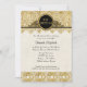 Elegante e sofisticado grandioso para o seu dia especial. Esta tomada moderna no estilo antigo Art Nouveau poderia facilmente desonrar uma série de estilos de casa de mansão inglesa ou uma ocasião formal. Mostrada aqui para uma celebração do Bat Mitzvah, esta design está disponível nestas outras categorias: Festas de aniversário, Anniversários, Convites para Casamento e Chás de panela. Também disponível em uma variedade de cores. O fundo é um padrão floral úmido, sutil e úmido em dois tons de creme esbranquiçado. O local como as bordas é renderizado em um brilho de ouro falso, muito realista, com faíscas de luz brilhando. Um quadro de Art Deco com roletas em preto e ouro marca o título do seu evento. No verso está uma bela estrela do símbolo David emblema. Os campos de modelo são fáceis de personalizar para a sua própria formulação de convite personalizada.