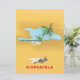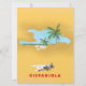 Mapa da Hispaniola, praia arenosa e palmeiras da ilha caribenha.
