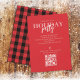Esta design apresenta uma festa de Natal simples, rústica, fazenda de fazenda ao norte, xadrez mínima minimalista de búfalos, vermelho e preto, férias de Natal se reúnem, letra moderna do roteiro de caligrafia, com estilo de texto da tipografia da na moda, uma celebração elegante e simplista do país, convites para festas de Natal, um simples convite básico para festas limpas com código QR para os convidados, junto com um ícone de mapa
