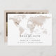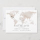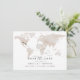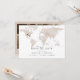 Esta opção de salvar a data apresenta um mapa do mundo da cor d'água bege, uma combinação simples de fontes e uma foto opcional no verso com um espaço para o seu site de casamento. Esta data salva é perfeita para o seu viagem, destino ou aventura casamento ou evento temático. Para alterar o local do coração, role para baixo na seção de personalização e selecione a opção azul 'clique para personalizar mais'.