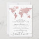 Convite de casamento de destino de mapa-múndi rosa discreto com um marcador de localização em forma de coração que você pode mover para marcar a localização do seu casamento e criar um convite elegante com tema de viagem rosa e cinza para uma recepção local em casa ou casamento de destino.