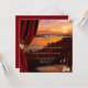 Um convite romântico à festa de noivado que apresenta uma mesa com óculos de vinho e garrafa no pôr do sol com vista para um rio. Uma cortina de veludo com cipós e rosas completa a cena.