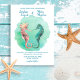 Sob o mar, o convite de casamento do tema da praia apresenta um casal bonito, beijando o cavalo marinho em um fundo "oceano" de cor d'água. O lado inverso é um bonito azul marinho. Personalize com seus detalhes de casamento. Trabalho de arte original do KL Stock. Visite minha coleção de casamento "Sea of Love" para coordenar recepção, cartas de RSVP, etc.