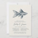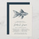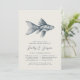Nossos convites para o janto de ensaio cômico costeiro apresentam uma ilustração de peixe estilo gravado vintage em azul rico marinho sobre um creme de fundo branco. Personalize com seu ensaio de cerimônia de casamento e jante ou detalhes da festa embaixo. Adoramos este convite impresso no estilo de papel Laid para um acabamento luxo e textura.