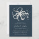 Nossos convites para janto de ensaio de chic costeiro apresentam uma ilustração de polvo estilo gravado vintage em branco sobre fundo azul marinho. Personalize com seu ensaio de cerimônia de casamento e jante detalhes de comemoração abaixo.