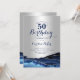 Marinho azul e prata agate 50º convite de aniversário. Elegante design moderno com cor azul-real de água agate marble geode fundo, faux glitter prata e script de tipografia. Trendy convida o cartão perfeito para uma comemoração de dia das mulheres na moda. Impressos convites Zazzle ou modelo de impressão digital instantânea para download.