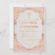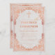 Este elegante primeiro convite da comunhão com ar vintage, recomendado para uma menina, tem um ornamentado falso de folha de ouro rosa com decorações barrocas elegantes em fundo de mármore branco. Acima do texto, há uma cruz religiosa em ouro rosa. Exceto a ocasião "Primeira Comunhão Sagrada", que também está em ouro rosa, todo texto pode ser personalizado e tem uma cor rosa similar à do quadro do ouro rosa. A safra, quadro de ornamentado, baseia-se numa antiga ligação francesa ao cobrir de livro, de Georges Mercier (1885-1939) - Madame de Maupin, por Theophile Gautier, edição de 1911, agora no dominio público.