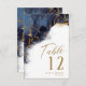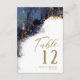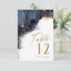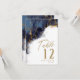 Um fundo abstrato que lembra o mármore em tons de azul marinho veinado com ouro reluzente é o pano de fundo para textos elegantes e layouts modernos de design nos pedaços desta bela suíte de casamento. O cartão de número da tabela de casamento mostrado aqui contém o texto acima, mais o texto opcional do roteiro de Mesa e um modelo para adicionar os nomes da noiva e do noivo e a data do casamento. Procure ID644 para ver todas as peças de coordenação neste conjunto.