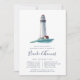 Os convites de janto de ensaio costeiro elegantes apresentam uma ilustração aquosa de um farol em marinho, vermelho e branco em um mar lacrimogêneo, derrubando seu ensaio de cerimônia e detalhes de celebração em caracteres azul-marinho náutica.