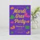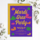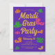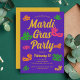 Mardi Gras convite de festas com máscaras de Carnaval roxas, amarelas, cor-de-rosa e laranja. Modelo personalizado que você pode personalizar com os detalhes de comemoração de terça-feira gorda.