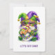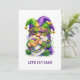 A whimsical gnome, adorned in a vibrant Mardi Gras mask and jester hat, happily enjoys a slice of king cake while sporting colorful beads.