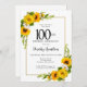 Cartão de aniversário de 100 anos, floral amarelo bonito. Peônias amarelas e margaridas brancas se misturam com os girassóis. Um quadro retangular de ouro lhe dá uma vibração elegante. Muito fácil de personalizar. Essa parte de trás é branca com um buquê de girassol. Isto é perfeito para uma celebração de aniversário de verão.