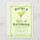 Convite de chá de panela Margs & Matrimony coquetel e listras rabiscadas. Este convite moderno apresenta uma ilustração encantadora de um copo de coquetel margarita adornado com fatias de limão, capturando perfeitamente o espírito de um chá de panela divertido. O fundo apresenta um padrão vibrante de listras verdes e brancas que adiciona um toque refrescante, evocando sentimentos de calor e alegria. Ao redor do convite há uma borda caprichosa rabiscada em verde limão, adornada com corações brincalhões, o que adiciona um toque romântico ao design geral. Este convite não é apenas uma peça de papelaria; é um convite para uma celebração sincera de amor e amizade, definindo o tom para um evento inesquecível.