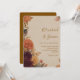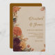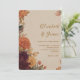 Convite de casamento romântico e elegante para feiticeiros rústicos, com flores marigadas, crisântemum, e dahlia floral outono com fronteira de safra. Cor de laranja quente, burgundy, tons de ouro e folhas de outono são pares de folhas com bege para um cheio de design botânico de charme boêmico. Perfeito para primavera, verão, ou celebrações de outono com terracota e sotaques laranja queimados.