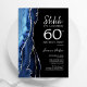 Marinho azul, preto e prateado agata surpresa 60º convite de aniversário. Elegante design moderno com cor azul-real de água agate marble geode fundo, faux glitter prata e script de tipografia. Trendy convida o cartão perfeito para uma comemoração de dia das mulheres na moda. Impressos convites Zazzle ou modelo de impressão digital instantânea para download.