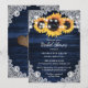 Belos convites de chá de panela rústicos de marinho azul e girassol com flores de girassol e rendas florais brancas contra fundo de madeira rústica. Itens correspondentes disponíveis.