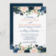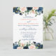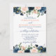 O belo convite de casamento floral boho apresenta gráficos florais pintados manualmente com aquarela/rosas em tons ricos de azul-marinho e cor-de-rosa-pincel/pêssego e uma fonte encantadora de estilo de letreiros manuais.