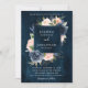 O belo convite de casamento floral boho apresenta gráficos florais pintados manualmente com aquarela/rosas em tons ricos de azul-marinho e cor-de-rosa-pincel/pêssego e uma fonte encantadora de estilo de letreiros manuais. Entre em contato comigo para obter ajuda sobre a personalização ou se você precisar de outro produto com este design.