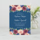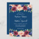 Estes convites para o casamento apresentam um design floral moderno com flores de cor-de-água azul-arrojadas, escamosas e marinhos sobre um fundo azul-marinho. Personalize-os com o seu convite.