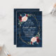 Convites de chá de panela cor-de-rosa azul-azul-marinho-azul-brilhante Dourado - apresentam um celeiro azul-marinho escuro ou fundo de grãos de madeira decorado com uma estrutura geométrica de ouro impressa que é aparada com elementos florais e verdes em tons de marinho, rosa, burgundy e muito mais. Exibir a coleção correspondente nesta página para localizar itens de coordenação.