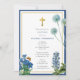 Um belo design que mostra flores botânicas de cor azul-d-água com sotaques dourados. Um design elegante ideal para o Natal Batismo de um bebê. Papelaria e decoração correspondentes podem ser vistos nesta coleção de designs.