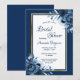 Na frente: um fundo azul marinho com um quadro fino de ouro simples e branco. Decorado com flores azuis, rosas. Modelos para a noiva ser o nome e os detalhes da festa. O nome e o texto: Chá de panela são escritos com um script de estilo manuscrito, letras azuis coloridas. Traseira: fundo Marinho azul colorido.