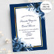 Na frente: um fundo azul marinho com um quadro fino de ouro simples e branco. Decorado com flores azuis, rosas. Modelos para seus nomes e detalhes do casamento. Os nomes são escritos com um script de estilo manuscrito, letras azuis. Traseira: fundo Marinho azul colorido.