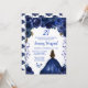 Este elegante e glamouroso convite de aniversário apresenta uma bela princesa com cabelo castanho e pele clara num vestido azul de marinho. O texto combina o script manuscrito e as fontes sans serif modernas para um aspecto elegante e sofisticado. Os arranjos florais, borboleta e confete criam a mistura perfeita de rústico e chic. Gráficos por www.etsy.com/uk/shop/SunflowerDayLove