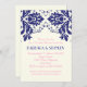 Elegante damask motif marinho azul, rosa, casais de casamento de marfim convite para chá. Um design de casamento moderno, mas clássico, com um talento retrô. Um delicado design de casamento com vintage sente-o, perfeito para um casamento de primavera ou verão contemporâneo ou tradicional.