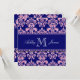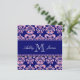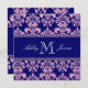 Envie estes Convites de Casamento para convidar seus convidados para o seu casamento de temas azuis, rosa e marinho. Esta design divertida, mas sofisticada, consiste em uma Cor damasco de Marinho Blue Vintage, efeito de brilho rosa impresso, Seu Monograma, Noiva e Nomes de noivo na frente e seu convite de casamento na parte de trás. Personalize com suas informações.