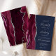 A borda esquerda deste elegante convite de casamento moderno apresenta uma cor d'água borrifada com borda cortada com cintilação falsa de prata. O texto personalizável combina a escrita manual de cinzas prateadas, fontes copperplate e itálico em um fundo azul marinho. O lado inverso apresenta um design de burgundy e agate prateado.