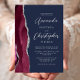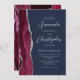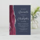 A borda esquerda deste elegante e moderno convite de casamento mostra uma cor vermelha e entrelaçada de água com uma falsa brilha prateada. O texto personalizável combina fontes de script e sans serif em cinzas prateadas em um fundo azul marinho. O lado inverso apresenta um design de burgundy e agate prateado.