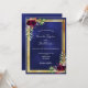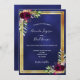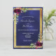 Um convite para casamento moderno e moderno. Um fundo azul escuro, azul marinho. A cor azul é irregular. Com uma falso armação de ouro e florais impermeáveis, flores com verde. Modelos para seus nomes e informações sobre cerimônias. Os nomes são escritos com um moderno estilo escrito à mão. Fundo: fundo azul.